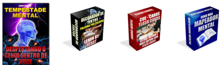 O curso Tempestade Mental- como desenvolver ideiasO Aplicativo Decorador de TextosO Aplicativo Cue Cards (para memorizar pares de informacao)O Aplicativo Mind Mapper (para fazer seus mapas mentais)